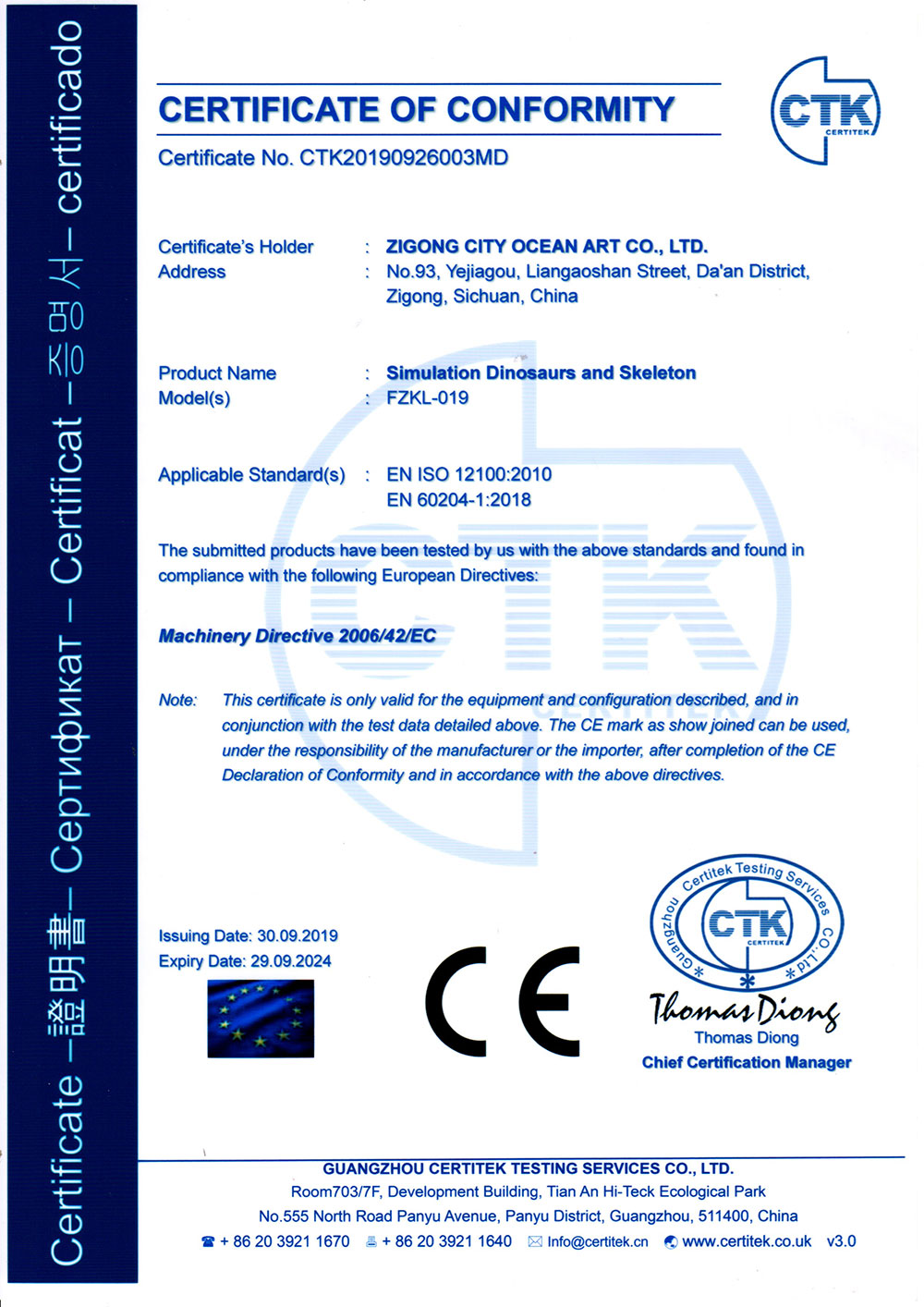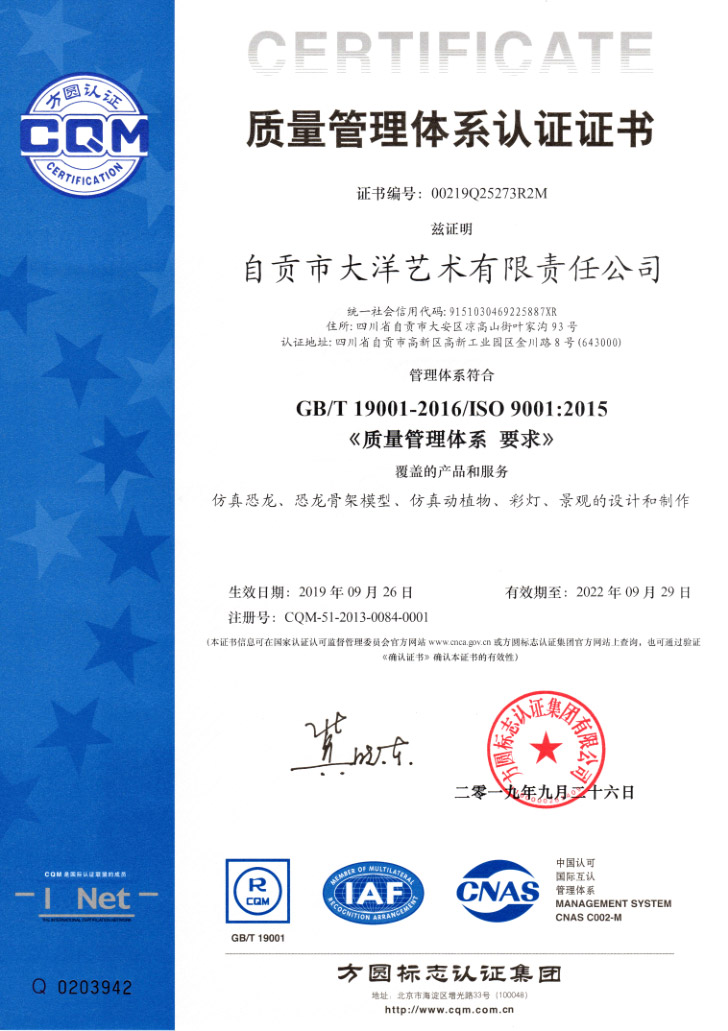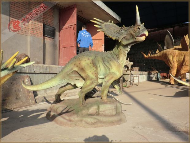 自貢市大洋藝術有限責任公司簡介自貢市大洋藝術有限責任公司,為中國恐龍展品制作基地,成立于2009年,是專業從事恐龍化石骨架標本模型、仿真活體機器恐龍、仿真雕塑恐龍、玻璃鋼恐龍、恐龍游樂場互動設備等展品的研制開發、出售和展覽的高科技企業。并在中國古生物專家的指導下進行開發制作恐龍和仿真動物展品,所制作的恐龍展品,被中國科學院鑒定為“優秀科研作品”,被譽為“侏羅紀”的再現者。公司占地面積30000平方米,有一支專業研制恐龍標本模型和機器恐龍展品的職工隊伍和一套具有先進性能的生產設備,年生產能力為500萬美元,其中約70%的出口。我們研制和生產的恐龍展品,以其造型逼真、表皮質感強、動作協調自如、組合情節科學、價格合理、售后服務佳而倍受國內外客戶的青睞和好評。十多年來,我們先后為美國、加拿大、阿根廷、秘魯、匈牙利、奧地利、荷蘭、澳大利亞和我國的香港、臺灣地區以及北京自然博物館、天津自然博物館、上海自然博物館、重慶自然博物館、浙江自然博物館、成都理工大學博物館、太原中國煤炭博物館、內蒙二連浩特恐龍博物館、武漢中國地質大學博物館、西峽恐龍蛋博物館、朝陽鳥化石博物館、河源恐龍博物館、常州中華恐龍園、云南祿豐世界恐龍谷等地區的博物館和恐龍主題公園以及人民公園制作和提供了相當數量的恐龍展品。同時,先后為重慶恐龍公園、海南恐龍公園、晉江新世紀恐龍公園、番禺古生物博物館、東莞古生物博物館、西峽恐龍蛋博物館設計和陳列布展。