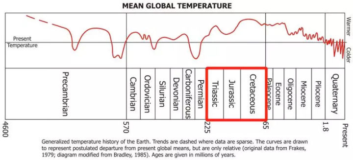 但很遺憾,恐龍所生活的三疊紀、侏羅紀、白堊紀三個地質時期幾乎是地球溫度最高的時期。