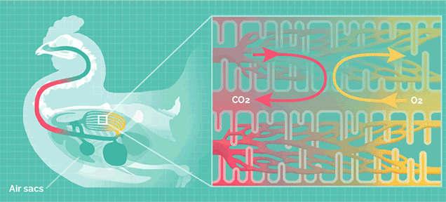 這種結構可以讓肺部實現無論吸氣還是呼氣都能攝取氧氣,稱為“雙重呼吸”,其效率是哺乳動物的2.5倍。
