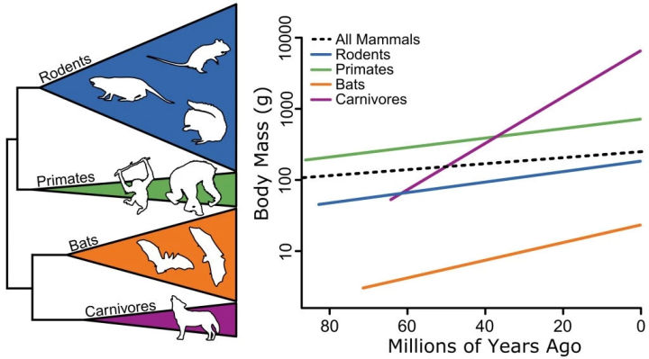比如恐龍的體型不斷變大,而哺乳動物的體型也不斷變大,但更晚繁榮的哺乳動物不一定會比更早出現的恐龍大。