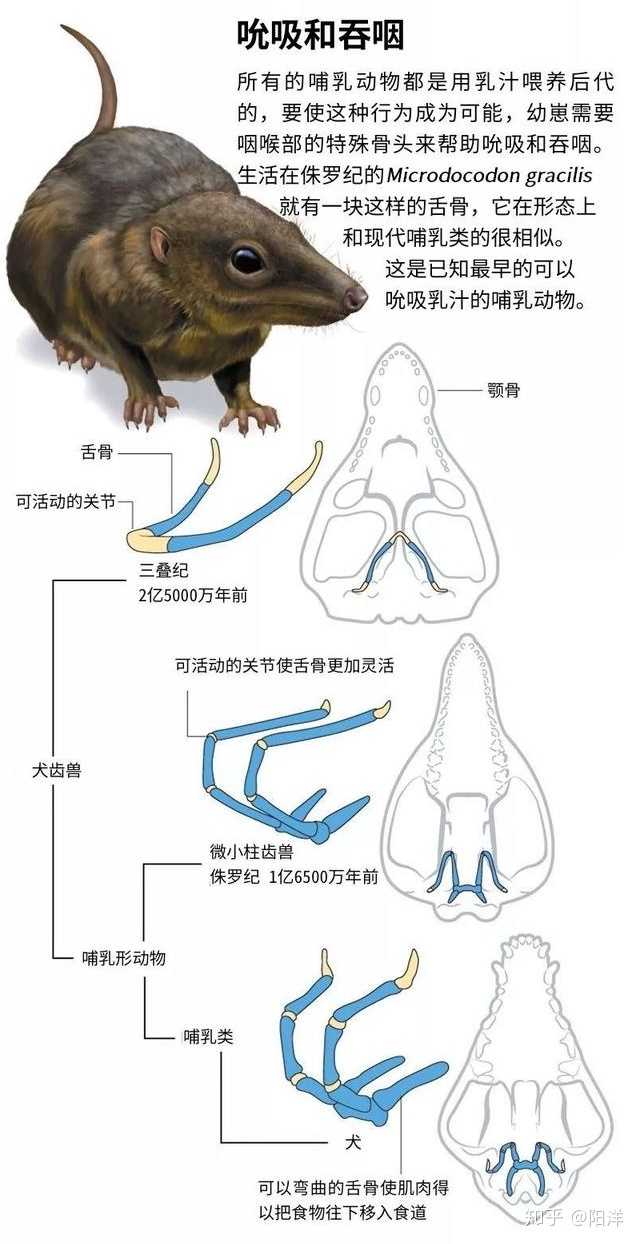 現代哺乳類的幼崽生下來都會本能地吸吮乳汁,但吸吮這個看似簡單的動作實現起來卻沒有那么簡單,哺乳類實現吸吮靠的是其特殊的舌骨結構,與爬行動物的簡單棒狀舌骨不同,現生哺乳類的舌骨構造是由甲狀舌骨、基舌骨、角舌骨和上舌骨組成的一個鞍狀關節。無論是現存最原始的鴨嘴獸,或是早早分化出去的有袋類,還是包括人類在內絕大部分哺乳類所屬的真獸都擁有這種舌骨關節,所以它們的幼仔都能吸吮乳汁,“哺乳類”這個名稱也由此得名。