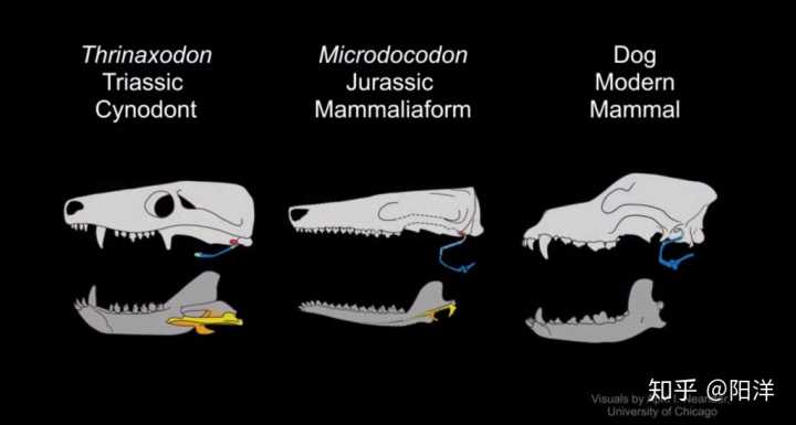 (下圖所示早期合弓綱到現代哺乳類的聽骨進化)