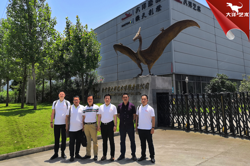 2019年6月,沈陽客戶到廠參觀,定制了一批玻璃鋼恐龍,與負責人合影留念。