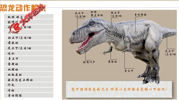 4. 采用優(yōu)質(zhì)電機和電器元件控制恐龍展品動作,達到經(jīng)久耐用動作靈活協(xié)調(diào)的效果。