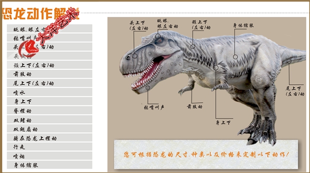 4. 采用優(yōu)質(zhì)電機(jī)和電器元件控制恐龍展品動(dòng)作,達(dá)到經(jīng)久耐用動(dòng)作靈活協(xié)調(diào)的效果。