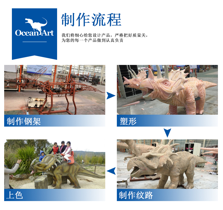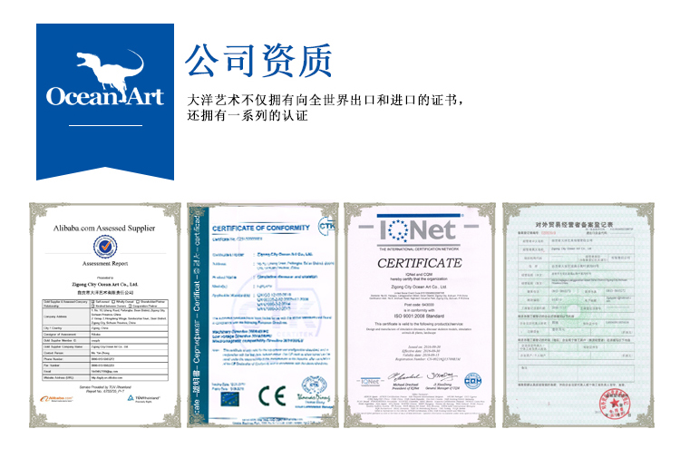 備注: 我們所制作的仿真恐龍展品和骨架模型展品被中國科學院古脊椎所鑒定為“優秀科研作品”被譽為”侏羅紀“的在現者。我們將秉承客戶至上的理念,為客戶設計和制造恐龍展品,并根據客戶的要求提供3年以上質量保證,并長期為客戶提供培訓安裝維修人員和配件等售后服務,為顧客解除了恐龍展品長期使用展覽的后顧之憂。