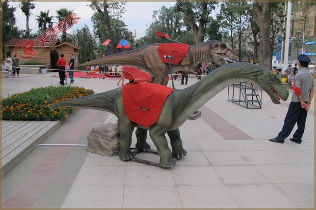 動(dòng) 作:張嘴叫聲、頭左右、身前后,后退伸曲、前肢擺動(dòng)、尾左右擺動(dòng)。投幣后觀眾可騎坐隨龍搖動(dòng)娛樂(lè)。