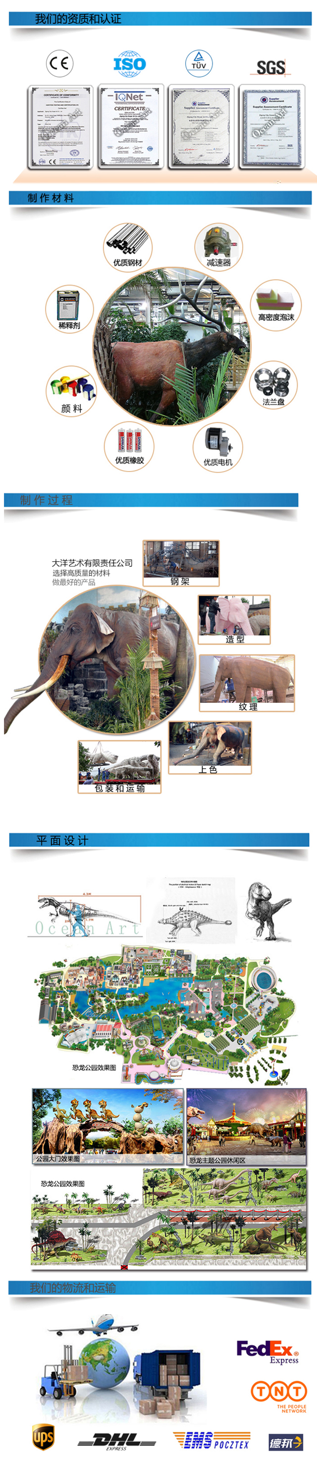 備注: 我們所制作的仿真恐龍展品和骨架模型展品被中國科學院古脊椎所鑒定為“優秀科研作品”被譽為”侏羅紀“的在現者。我們將秉承客戶至上的理念,為客戶設計和制造恐龍展品,并根據客戶的要求提供3年以上質量保證,并長期為客戶提供培訓安裝維修人員和配件等售后服務,為顧客解除了恐龍展品長期使用展覽的后顧之憂。