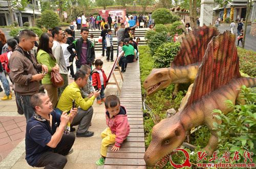 6月1日下午,記者在凱里世紀(jì)城水木花園展出現(xiàn)場看到,園林展區(qū)內(nèi)游人如織,熱鬧非凡。參觀群體絕大多數(shù)是家長和小孩,在此展出的仿真恐龍時而搖頭,時而擺尾,時而長大嘴巴露出雪白的牙齒,時而“舞手弄腳”,最逼真的當(dāng)屬仿真恐龍的一陣陣叫聲。小孩們在家長的陪伴下要么伸手逗“恐龍”玩,要么站在恐龍面前與之合影,要么在“恐龍蛋”內(nèi)體驗(yàn)“破殼成龍”的游戲。